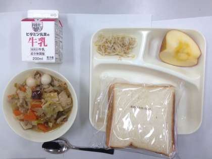 八宝菜、もやしのごま酢あえ、りんご、アプリコットジャム、食パン、牛乳 です。