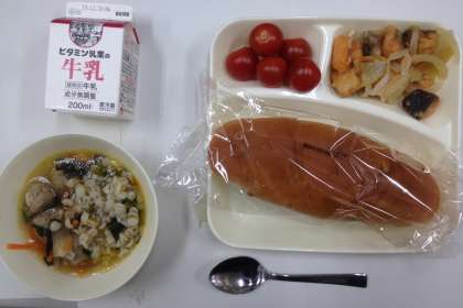 鮭のマリネ、肉団子と麦のスープ、プチトマト、レーズンパン、牛乳 です。