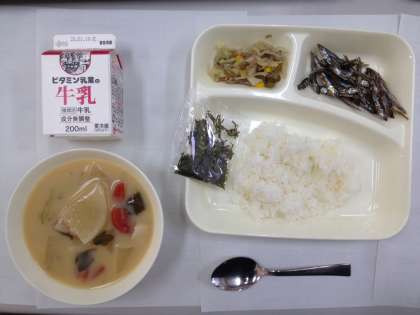 牛乳、レンコンのチラシ寿司、ぞう煮、ごまめ です。