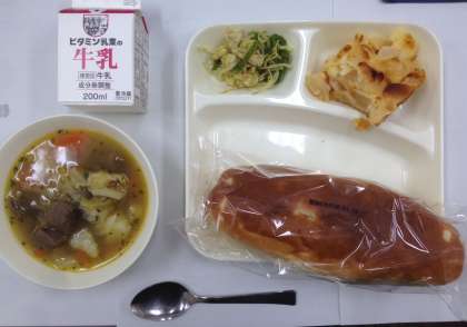 ポトフ、カレーソテー、おさつパン、牛乳、桃のクラフティ です。