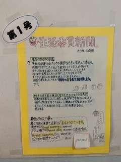 1年生の生活委員では、「相手の目を見て挨拶しよう」という目標をたてました。その目標を達成するために新聞を作ってくれました。