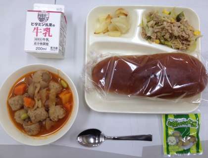 ミートボールのケチャップ煮、ツナと野菜のソテー、焼きジャガ、抹茶大豆、黒糖パン、牛乳 です。