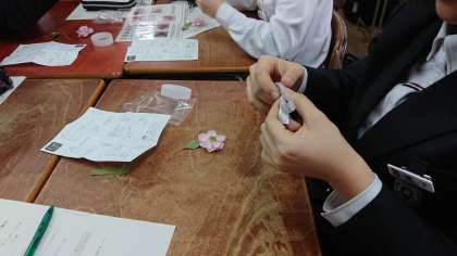コサージュづくりをするときに、2年生の班長は1年生のところに教えにいくので、2年生の各班は副班長がリーダーとなり、作り方を教えます。