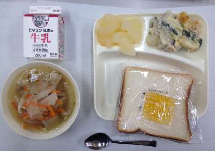 マカロニグラタン、大根と豚肉のスープ、和梨、食パン、マーマレード、牛乳 です。