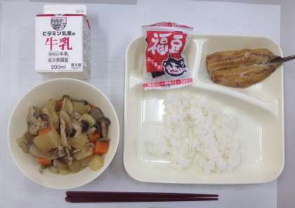 いわしのしょうゆがけ、含め豆、いり大豆、ご飯、牛乳 です。