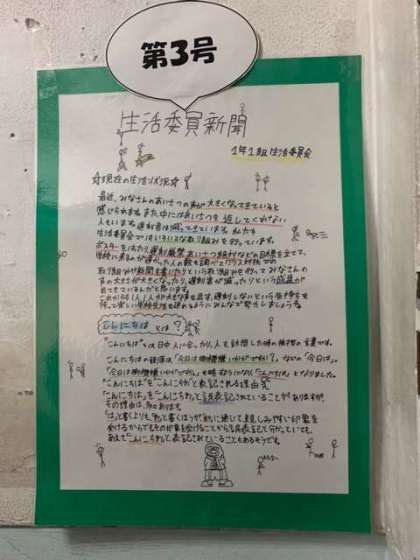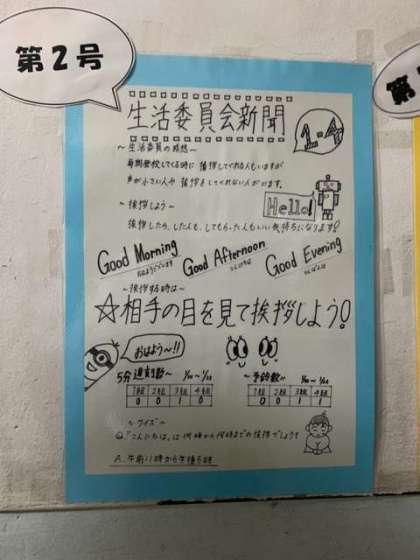 一年生生活委員では壁新聞を発行し、朝の挨拶の活性化に取り組んでいます。