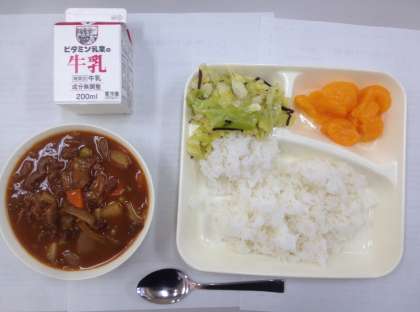 ハヤシライス、キャベツとひじきサラダ、みかん、牛乳 です。