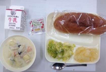 ほうれん草のクリームシチュー、キャベツのサラダ、洋梨、コッペパン、りんごジャム、牛乳 です。
