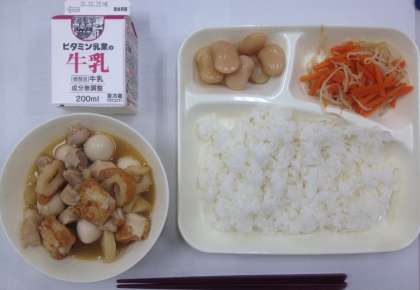 関東煮、もやしとにんじんの甘酢あえ、白花豆の煮物、ご飯、牛乳 です。