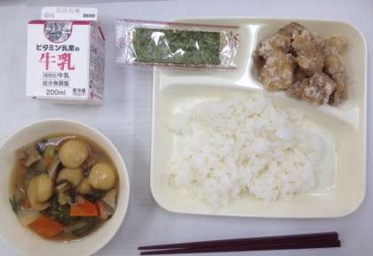 鶏肉の唐揚げ、まる天と野菜のうま煮、焼きのり、ご飯、牛乳 です。