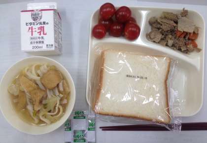 豚肉とごぼうの煮物、なにわうどん、プチトマト、食パン、ブルーベリージャム、牛乳 です。