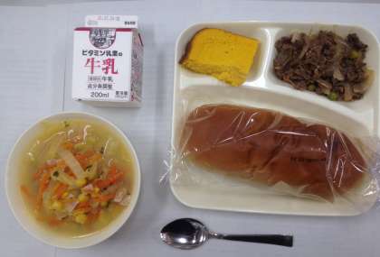 牛肉のデミグラスソース煮、コーンスープ、かぼちゃのプリン、黒糖パン、牛乳 です。