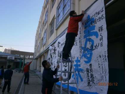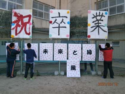 グラウンドのバックネットのところには同じく書道部の作品と生徒会を中心に作成したメッセージボードを掲示しています。明日の式に在校生は送辞を読む代表生徒しか参列できませんが、後輩たちの想いも届いてもらえたらと思います。