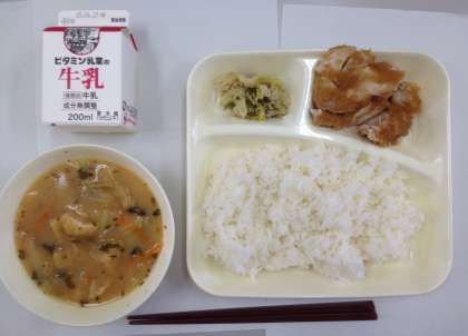 鶏肉のおろし醤油かけ、みそ汁、野菜炒め、ご飯、牛乳 です。