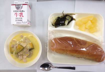 かぼちゃのクリームシチュー、ミックス海そうサラダ、りんご、黒糖パン、牛乳 です。夕食の献立にご参考ください。