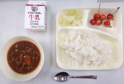 ハヤシライス、キャベツのゆずドレッシング、さくらんぼ、牛乳 です。