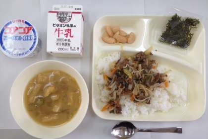 牛丼(ご飯)、とうがんのみそ汁、大福豆の煮もの、ヨーグルト、牛乳