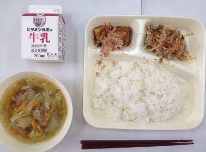 ゴーヤチャンプル、すまし汁、あつあげのしょうがじょうゆがけ、ご飯、牛乳 です。
