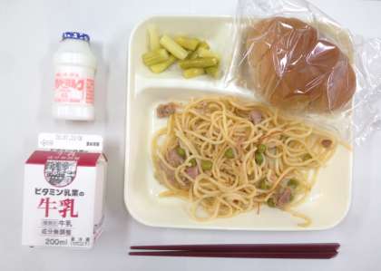 ポークとトマトのスパゲッティ、グリーンアスパラガスの酢サラダ、発酵乳、牛乳、黒糖ロールパン です。