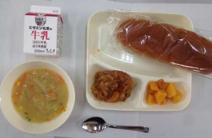 煮込みハンバーグ、コーンスープ、黄桃、黒糖パン、牛乳 です。
