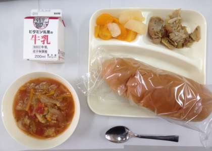 ミネストローネ、豚肉のカレー風味焼き、黒糖パン、ミックスフルーツ(缶詰)、牛乳 です。