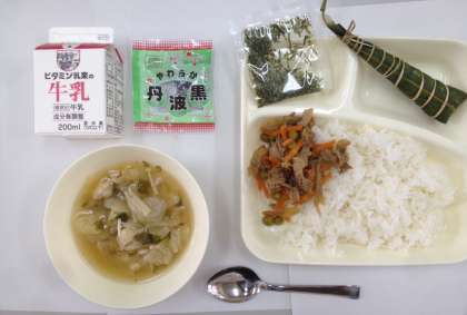 きんぴらちらし、すまし汁、ちまき、ソフト黒豆、牛乳 です。