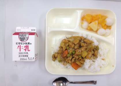チキンカレーライス、フルーツ白玉、牛乳 です。