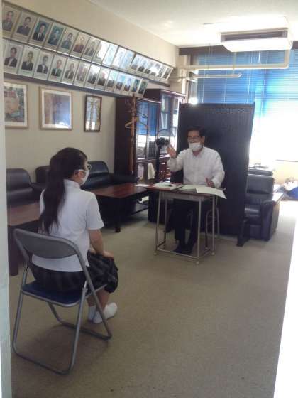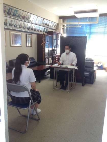 三年生の生徒たちはクラス懇談を終えると、すぐに校長室へ向かい、一人一人、校長先生との面接をおこなっています。