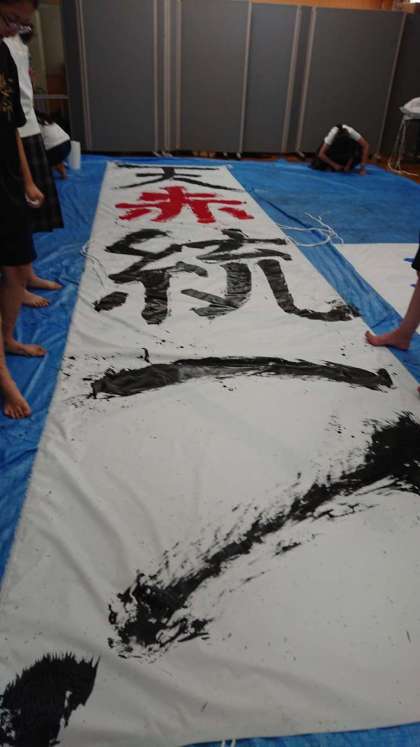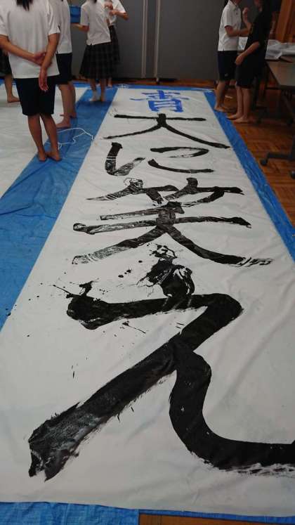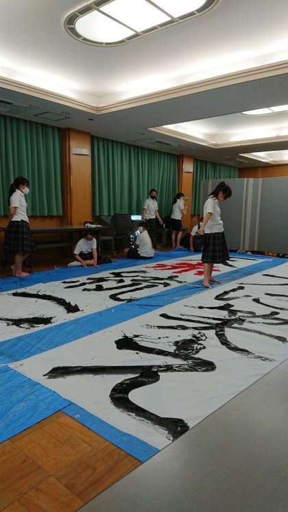 書道部では、体育大会のスローガンを垂れ幕に書いています。