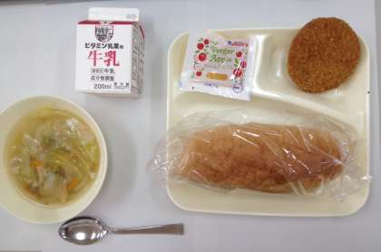 チキンレバーカツ、スープ、ライ麦パン、牛乳 です。