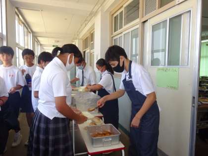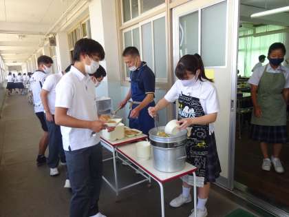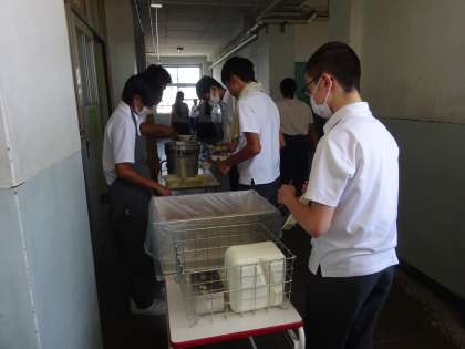 久しぶりの給食ですが、2年生は1学期から継続している取り組みのため、委員長がストップウォッチをもってくれています。