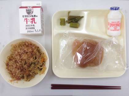 オイスターソース焼きそば、オクラの甘酢あえ、発酵乳、黒糖パン(ハーフ)、牛乳 です。