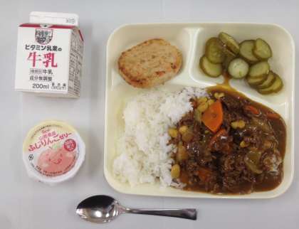 牛肉と大豆のカレーライス(ご飯)、とうふハンバーグ、きゅうりのピクルス、りんごゼリー、牛乳です。