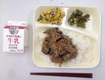 マーボーなす、ご飯、オクラの甘酢あえ、ツナとチンゲンサイのいためもの、牛乳です。