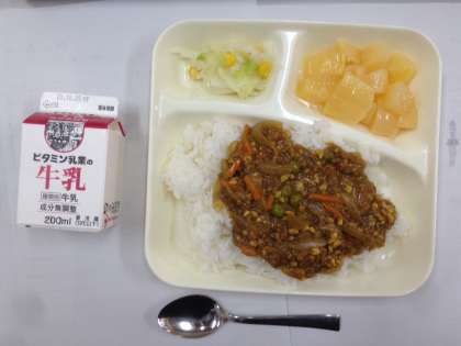 大豆入りキーマカレー、キャベツとコーンのサラダ、白桃、ご飯、牛乳 です。