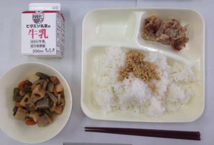 豚肉のねぎじょうゆ焼き、ふきよせ煮、ツナ大豆そぼろ、ご飯、牛乳 です。