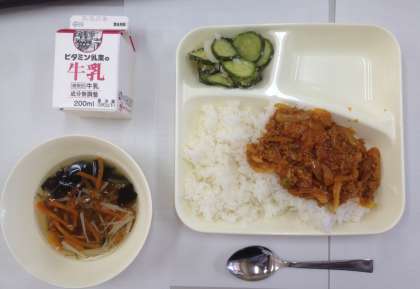タコライス、もずくのスープ、ジャガイモときゅうりのサラダ、牛乳 です。
