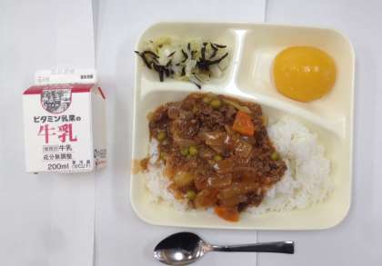ハヤシライス、キャベツのひじきドレッシング、黄桃(缶詰)、牛乳 です。