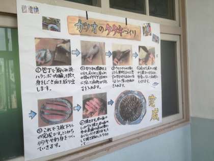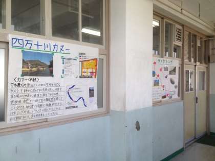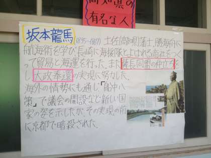 修学旅行についての調べ学習が掲示されています。