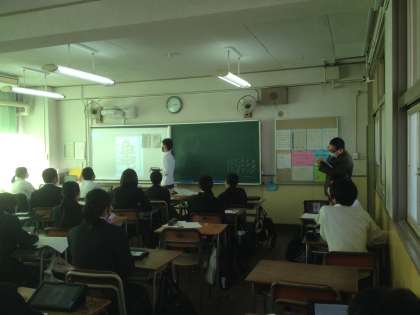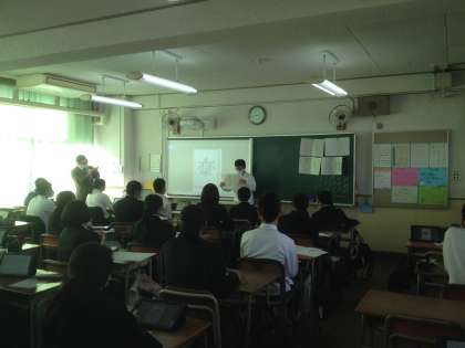 それぞれの班の代表者が、自分たちの考えをプレゼンテーションし、生徒たちは主体的に取り組んでいます。