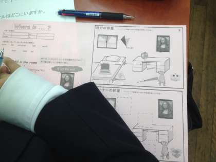 列ごとにプリントの絵を変え、お互いのペアで英語での説明で活用されています。非常に面白い仕掛けです。