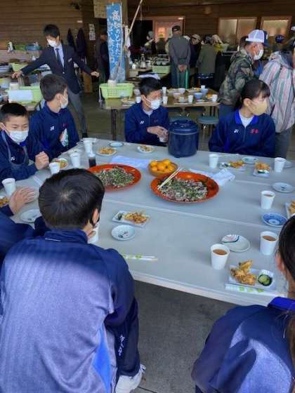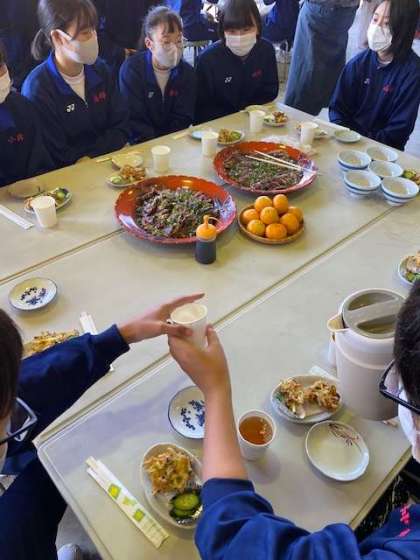昼食になります。かつおのたた木、天ぷら、ご飯、みかん、など