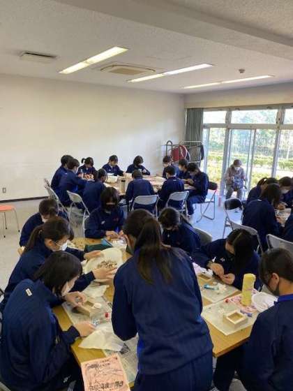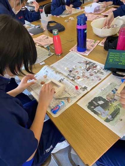 フォトプレート、小物入れに貝殻をボンドで飾りつけ。