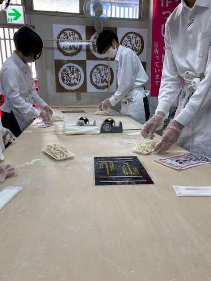 切り終えたら、絡まないように粉をかけ、トレイに整えます。そして、たれとともに袋につめ、出来上がり。お家で食べください。