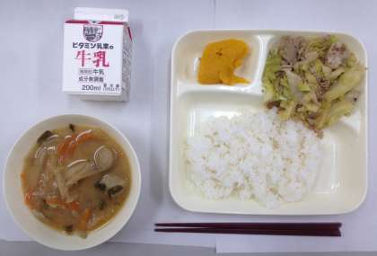豚肉と舞茸の炒め物、つみれ汁、かぼちゃのういろう、牛乳です。