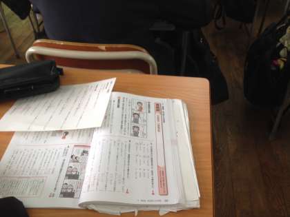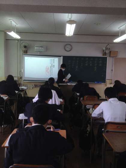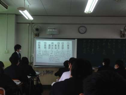 1限、2年3組、国語の授業、文法の分割の様子です。