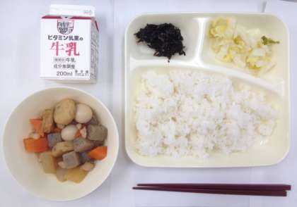 関東煮、はくさいの甘酢あえ、のりの佃煮、ご飯、牛乳 です。
