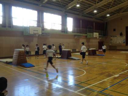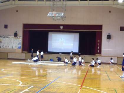 単元は、器械(跳び箱)運動です。生徒同士で自分の動きを、タブレットで録画して確認しています。