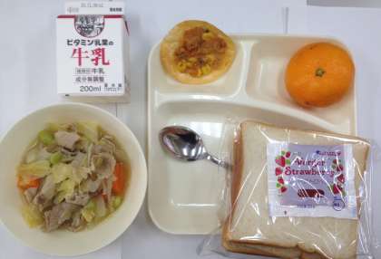 豚肉と野菜のスープ煮、変わりピザ、みかん、食パン、イチゴジャム、牛乳です。
