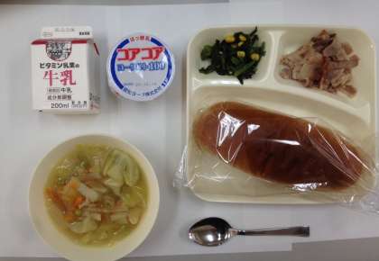 豚肉のガーリック焼き、野菜スープ、ほうれん草のソテー、ヨーグルト、黒糖パン、牛乳 です。